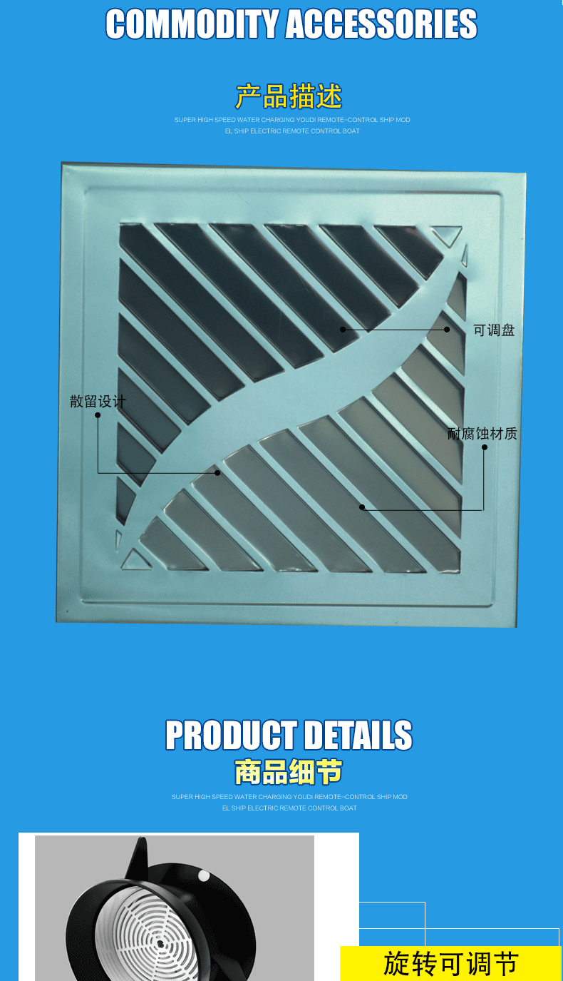 制作:風(fēng)口做成加厚型(外框1.0mm,葉片0.8mm);一般制作都是加厚型的,要薄型的可以跟客服聯(lián)系;也可烤兩遍漆,顏色可按客戶要求進(jìn)行烤制(價格另計(jì),量大從優(yōu))